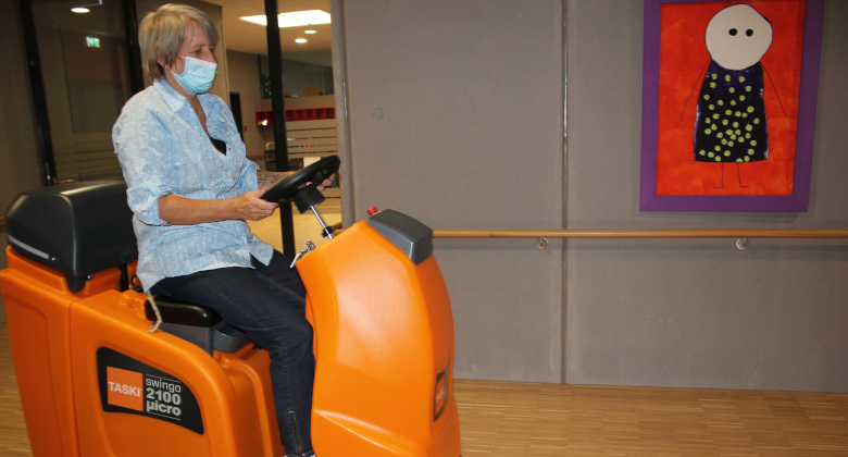 Eine Reinigungsmaschinenfirma führte uns eine handgeführte und eine Aufsitzscheuersaugmaschine vor. Letztere begeisterte das Team der Hauswirtschaft sofort. Auch etliche Schüler verfolgten am Rande die Vorführung aufmerksam. Wir staunten wie wendig die Maschine trotz der Größe ist und wie schnell der Boden mit wenig Kraftaufwand sauber wird. Als dann Herr Müller grünes Licht zum Kauf der Maschine gab, war die Freude groß.