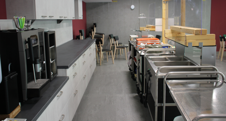Der Raum besticht durch klare Konturen und stimmige Farben. Holzwände wurden mit Sichtbeton kombiniert, eine breite Fensterfront mit Zugang zu einer großzügigen Terrasse macht den Raum hell. Bei gutem Wetter wird gerne draußen gegessen, ein großes, grünes Sonnensegel bietet Schutz vor zu starker Sonneneinstrahlung. Getränke- und der Kaffeeautomat wurden ansprechend in die neue Küchenzeile mit viel Platz für Geschirr und Besteck integriert. Stühle und Tische konnten wir vom alten Speisesaal übernommen werden.