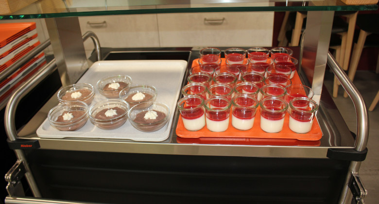 Eine Speisenausgabe, die coronatauglich umgebaut wurde, vervollständigt den Speisesaal. Heimbewohner und Mitarbeiter freuen sich über den freundlichen Speisesaal.