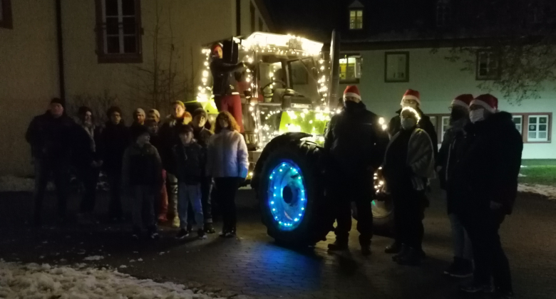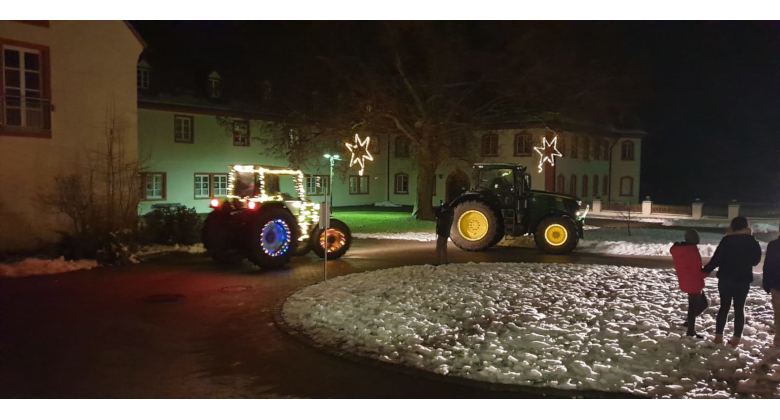 Traktoren, mit vielen bunten Lichterketten geschmückt, fahren im Konvoi laut hupend in den Schlosshof von Heudorf. Sie umrunden den Innenhof und Kinder und Jugendlichen begrüßen sie voller Freude und Jubel. Die Landwirte wollen mit ihrer Aktion Hoffnung schenken und für kleine Lichtblicke während der Coronazeit sorgen. Kleine Geschenktüten, liebevoll mit Weihnachtsgebäck, Orangen und Nüsse sowie Spielsachen, werden an die anwesenden Kids ausgeteilt. Höhepunkt für die Kids war aber, dass sie in die Fahrerkabinen reinstiegen durften. Ein supertolles Feeling.