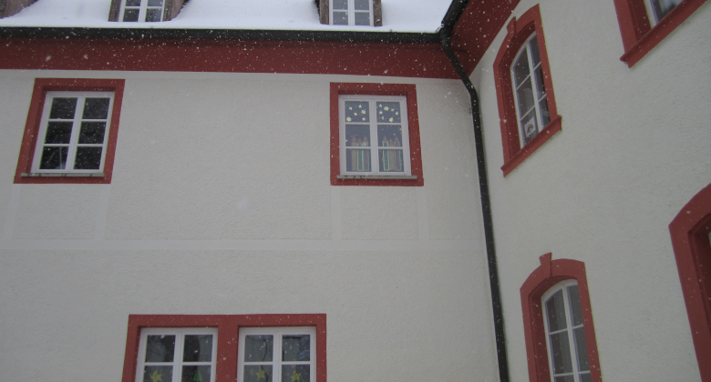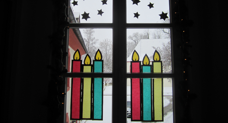 Pünktlich zum 01.12. fallen die ersten Schneeflocken in diesem Jahr. Sie decken das Land mit einem weißen Mantel zu und verzaubern es. Sterne werden an die Fenster des Schlosses geklebt und das erste Adventsfenster ist mit bunten Kerzen aus Transparentpapier gestaltet worden. Elektrische Lichter rücken das Fenster ins rechte Licht. Alles weist darauf hin, dass der Advent begonnen hat und wir die vorweihnachtliche Zeit nutzen, uns gemeinsam auf das Geburtsfest von Jesus vorzubereiten.