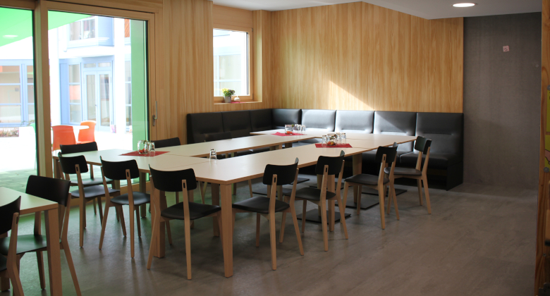 Der Raum besticht durch klare Konturen und stimmige Farben. Holzwände wurden mit Sichtbeton kombiniert, eine breite Fensterfront mit Zugang zu einer großzügigen Terrasse macht den Raum hell. Bei gutem Wetter wird gerne draußen gegessen, ein großes, grünes Sonnensegel bietet Schutz vor zu starker Sonneneinstrahlung. Getränke- und der Kaffeeautomat wurden ansprechend in die neue Küchenzeile mit viel Platz für Geschirr und Besteck integriert. Stühle und Tische konnten wir vom alten Speisesaal übernommen werden.