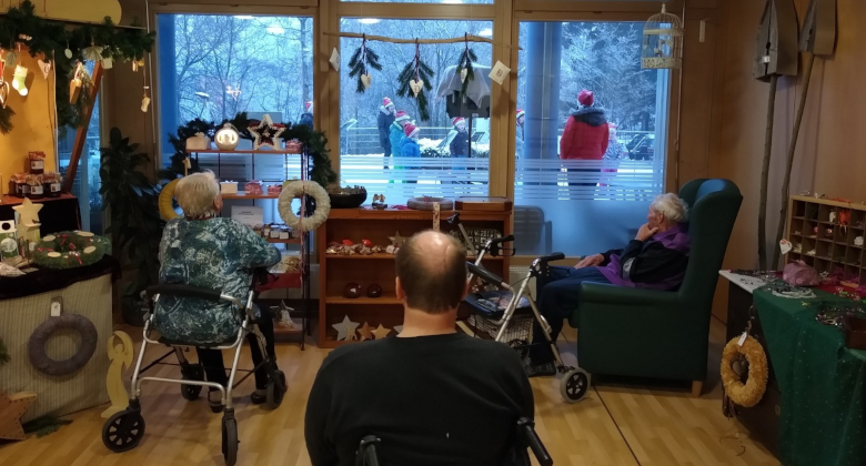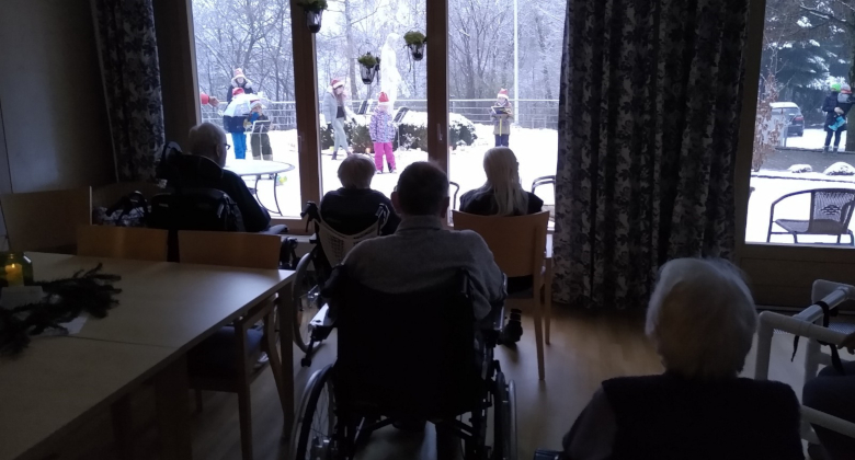 Trotz starkem Schneefall brachten sie den Frauen und Männern viel Freude. Diese konnten in der warme „Stube“ die schönen Adventslieder in Fülle genießen. Auch die Menschen, die in der Pflegeoase leben, wurden extra mit den Liedern des Kinder- und Jugendchores beschenkt.